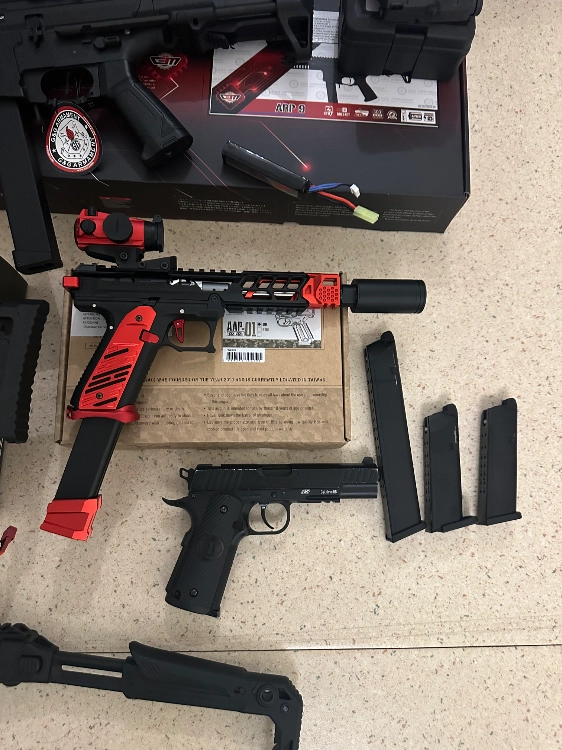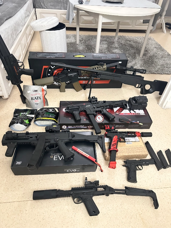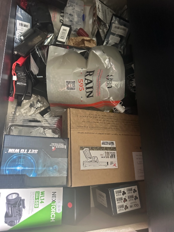 Avec cela, j’offre plein d’accessoires d’airsoft, plein de billes, des cartouches de gaz, des viseur, des poignées, des lasers. Toutes les batteries sont incluses avec ainsi que tous les chargeurs, il y en a même en plus avec tous les cartons si nécessaire, ainsi que toutes les factures.