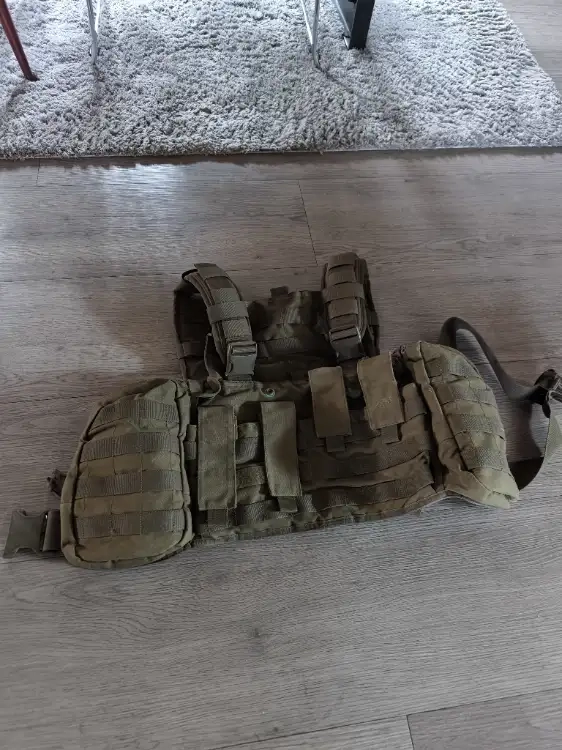 Je vends mon chest rig kaki contenance 6 chargeurs 5.56 ou 7.62, divers rangement sur les côtés et ajustable.