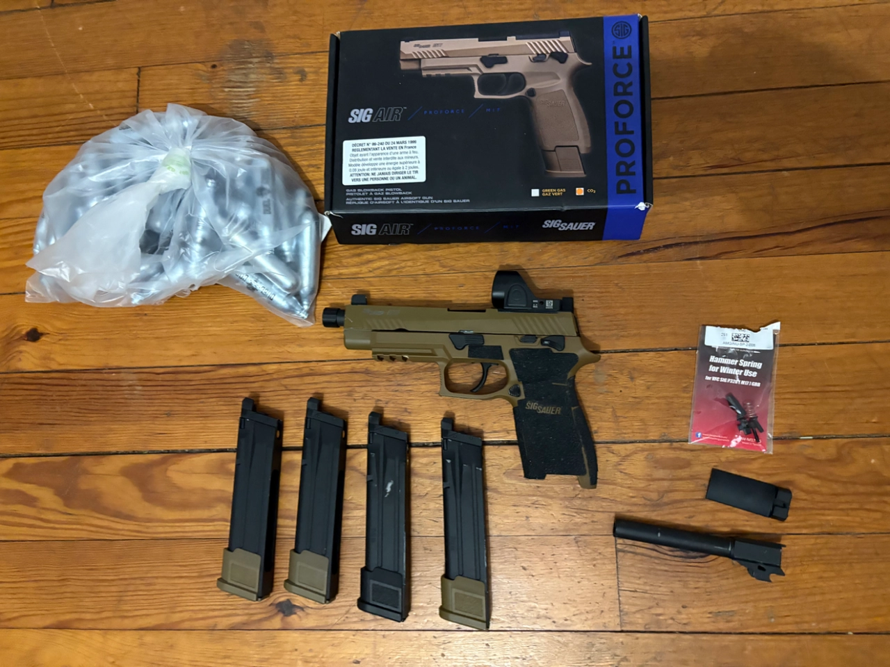 4 chargeurs : 2 gaz + 2 CO2 (1 chargeur CO2 avec une lèvre cassée)