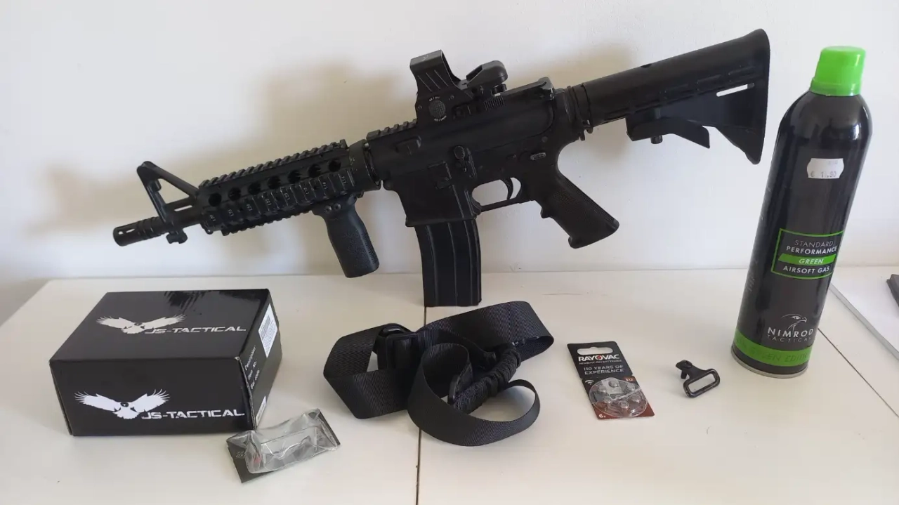 Fournie avec un chargeur (pas de fuite), un viseur point rouge/vert de la marque JS-Tactical (forme du point modifiable), un cache neuf pour protéger l'avant du viseur, des piles neuves pour le viseur, une poignée de la marque MOE (RVG), une sangle mono-point et une bouteille de gaz entamée de moitié je dirais.