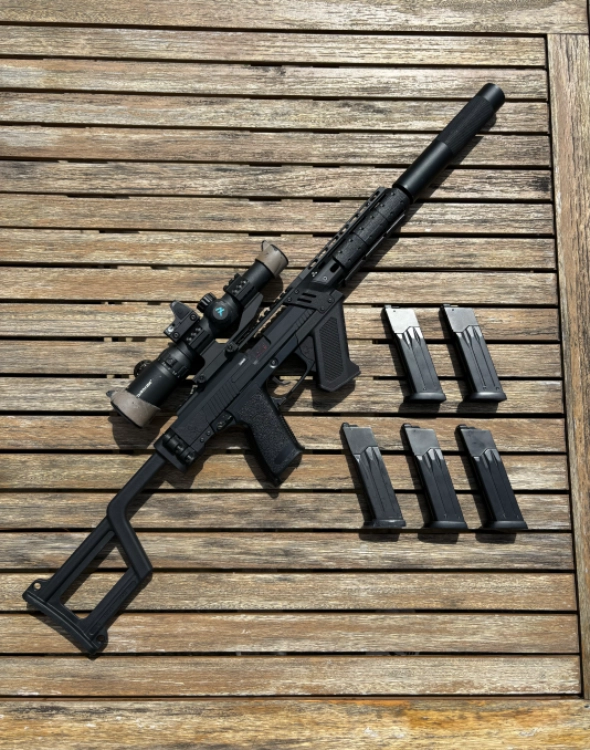 MK23 KIT TRIDOS CARABINE en version GBBR. Cette réplique n’a subi qu’une modification, celle d’un canon intérieur plus long, type VSR-10. Hormis cela, tout est de l’externe présenter ci-dessous :