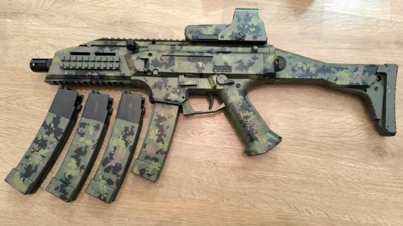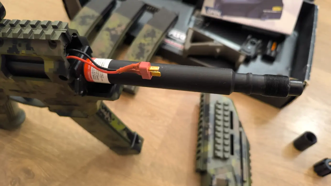 Un peu modifiée avec un connecteur T DEAN (fait chez Aerographe Airsoft Custom à Saintes), ainsi qu'un ressort moins puissant que celui d'origine pour baisser les FPS. Et esthétiquement avec une peinture par hydrographie sur la réplique, les 4 chargeurs et le viseur "EOTECH" (faite par une boutique d'airsoft du Sud-Est dont j'ai oublié le nom).