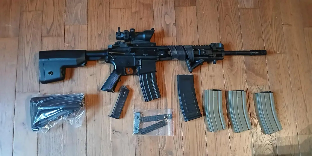 Fournit avec les accessoires d'origines : chargeur Hi-cap, crosse, mire plastique, batterie et son chargeur.