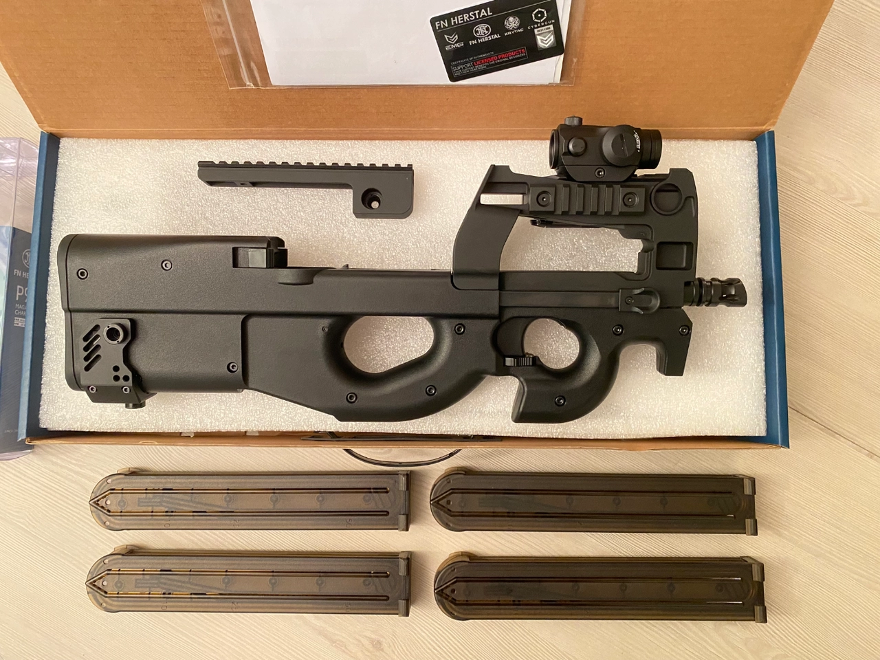 Lot complet P90 Krytac absolument neuf, n’a jamais vu le terrain, uniquement quelques tirs pour vérifier son bon fonctionnement.
