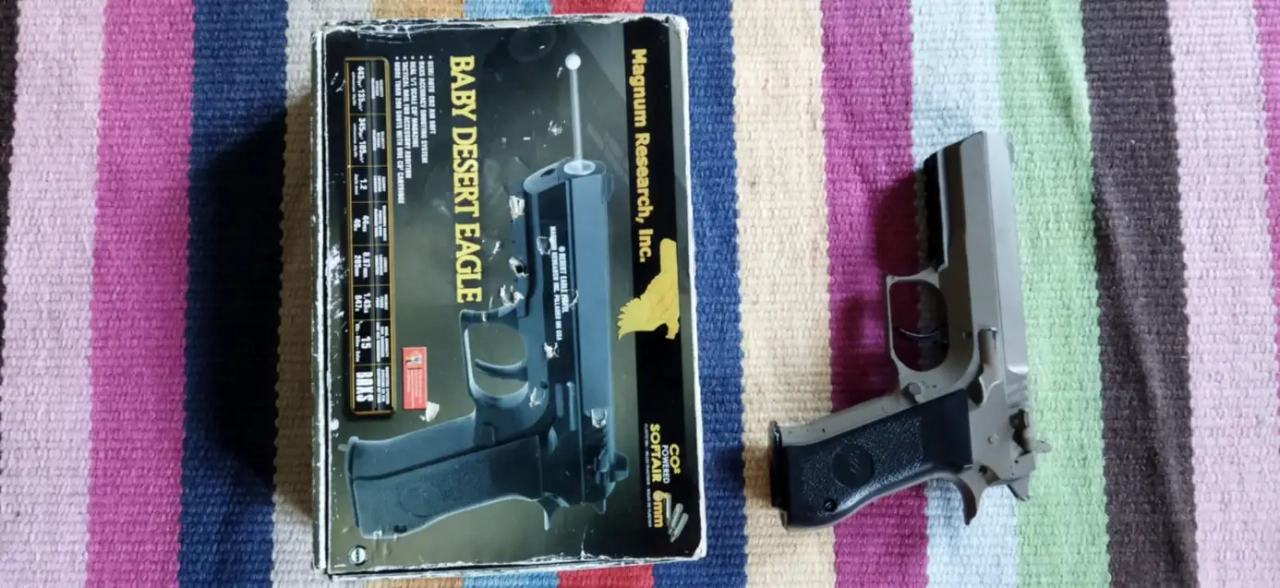 Je vous propose un Baby Desert Eagle NBB C02 Cybergun. Réplique achetée en brocante, dont je ne me sers plus vraiment. La réplique a clairement bien vécu mais est toujours fonctionnelle.