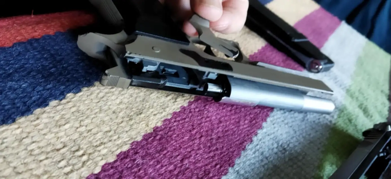 - l'arrêtoir de culasse (dans ma main sur la deuxième photo) qui ne tient pas très bien. La réplique fonctionne très bien sans lui et la culasse ne risque pas de tomber.