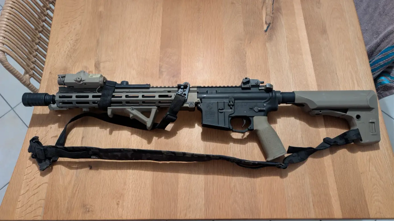 La poignée pistolet ainsi que la crosse ont été changées par du PTS, la crosse permet de mettre des grosses batteries dedans, toujours utilisé en 7.4V.
