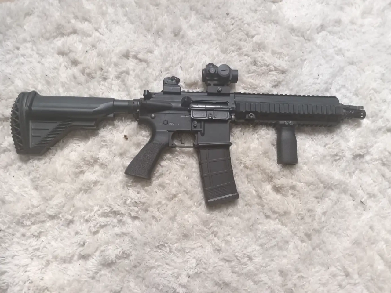 Je vend un hk 416 aeg marque classic army, état irréprochable, vendu avec 5 mid cap 110bbs et un T1 Vector optic,