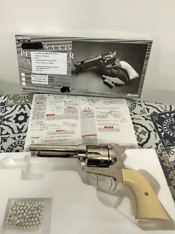 Faisant partie de la série MARUSHIN X-Cartridge, le SAA .45 Peacemaker est équipé de cartouches .45 à pointe BB ultra-réalistes, avec étui en laiton et embout en aluminium. Le Peacemaker est entièrement fabriqué en ABS, avec une poignée couleur ivoire et une carcasse à la finition argentée brillante.