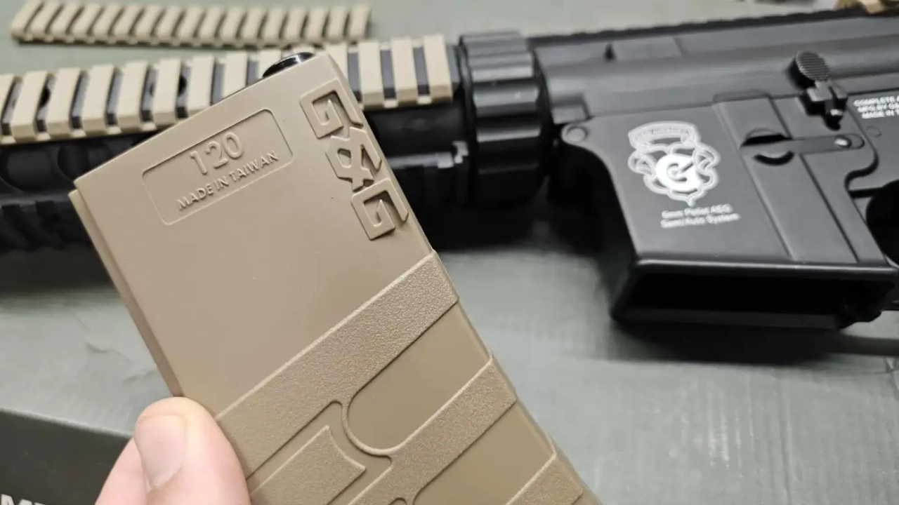 Vend réplique électrique blowback (EBB), marque G&G ARMAMENT, avec chargeur de batterie, chargeur de billes, speed loader, couvre rail couleur tan, notices, ...